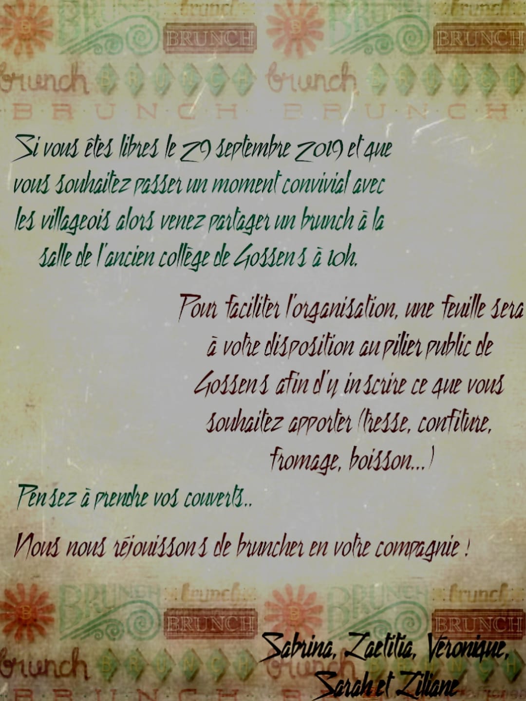 Brunch à Gossens – dimanche 29 septembre 2019 – 10h.00 – salle de l’ancien collège de Gossens