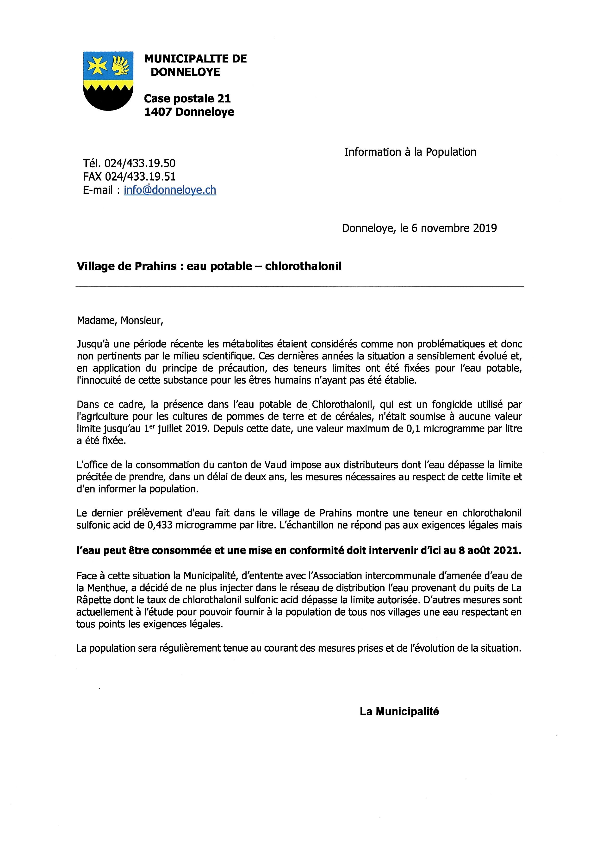 Village de Prahins – eau potable – chlorothalonil